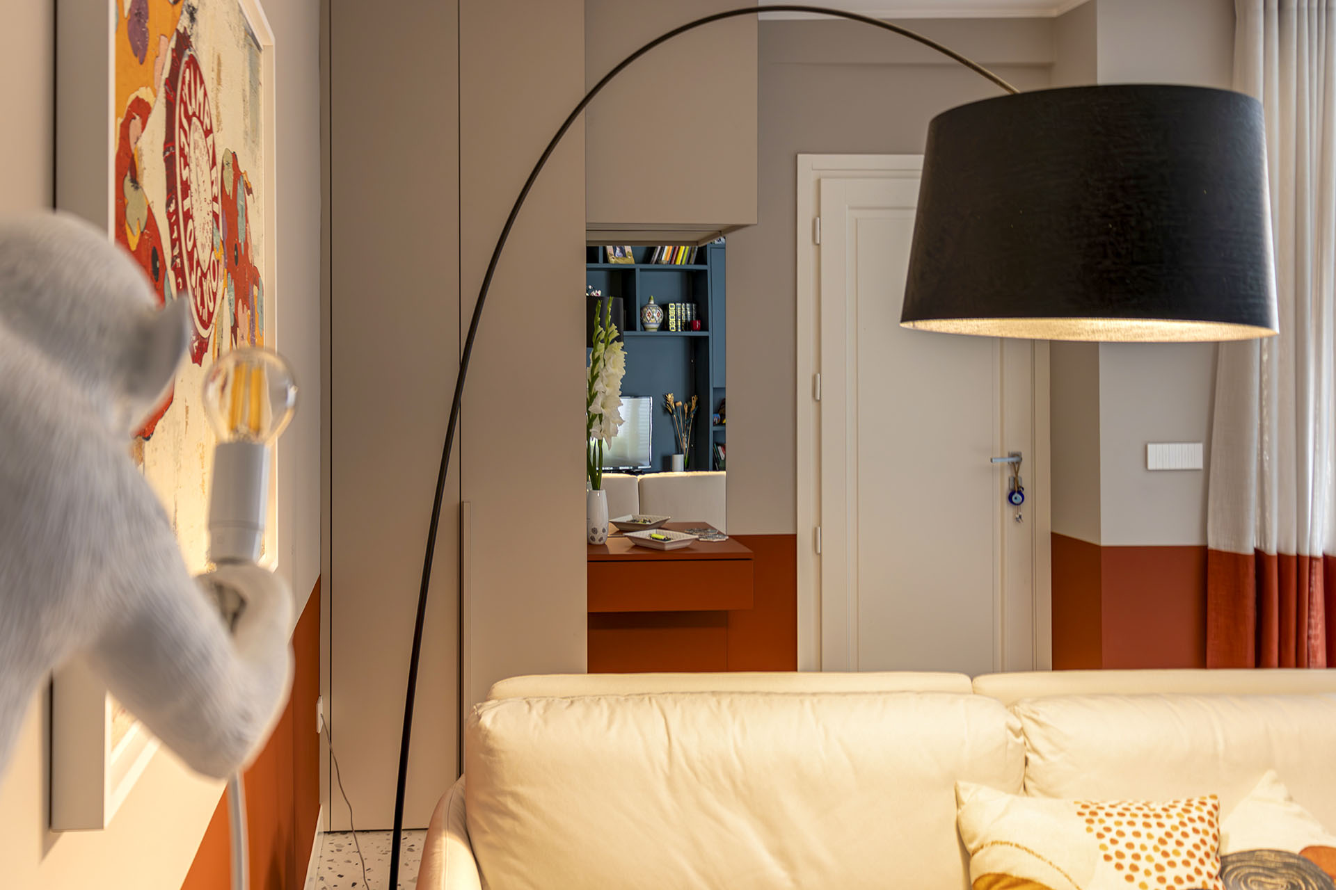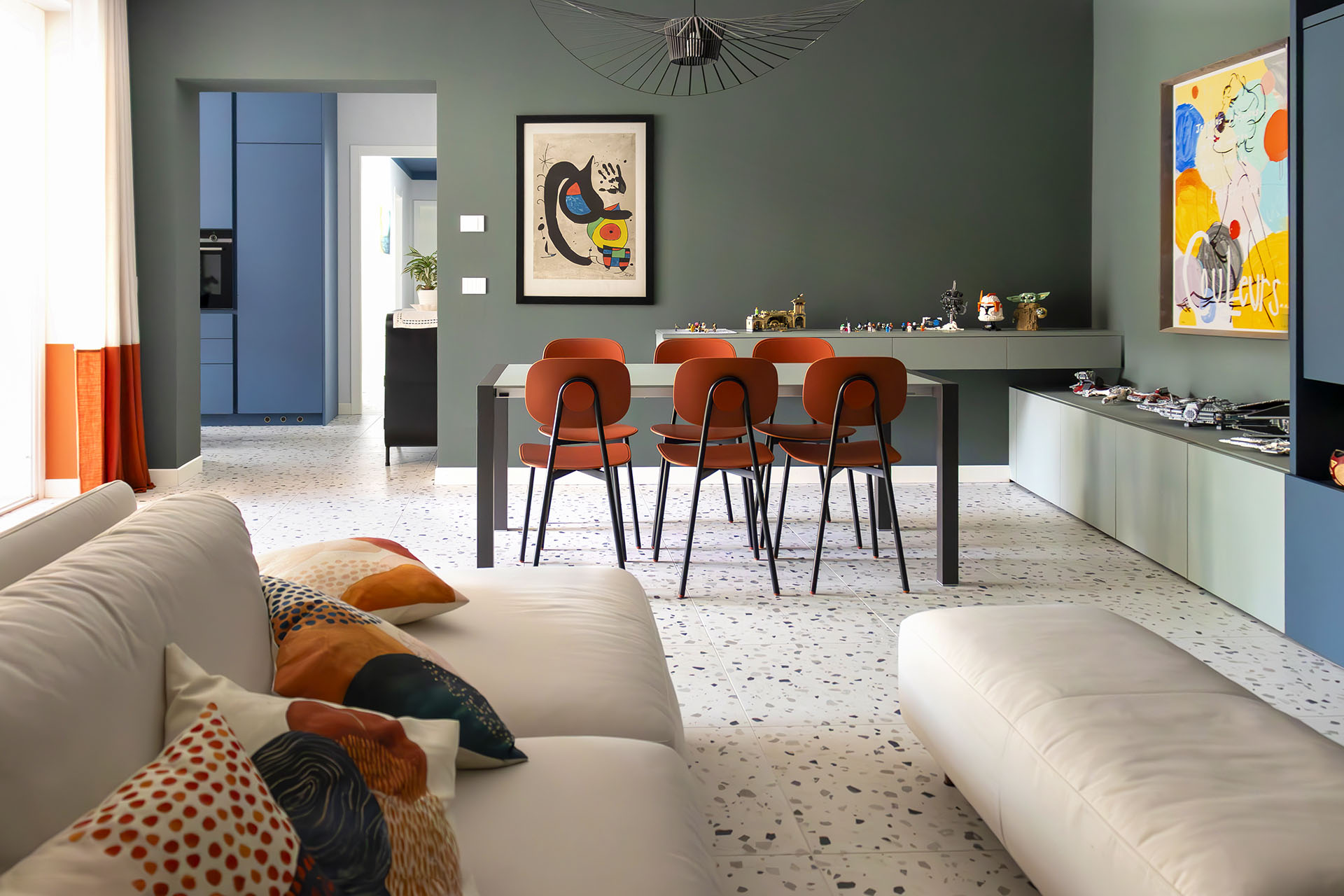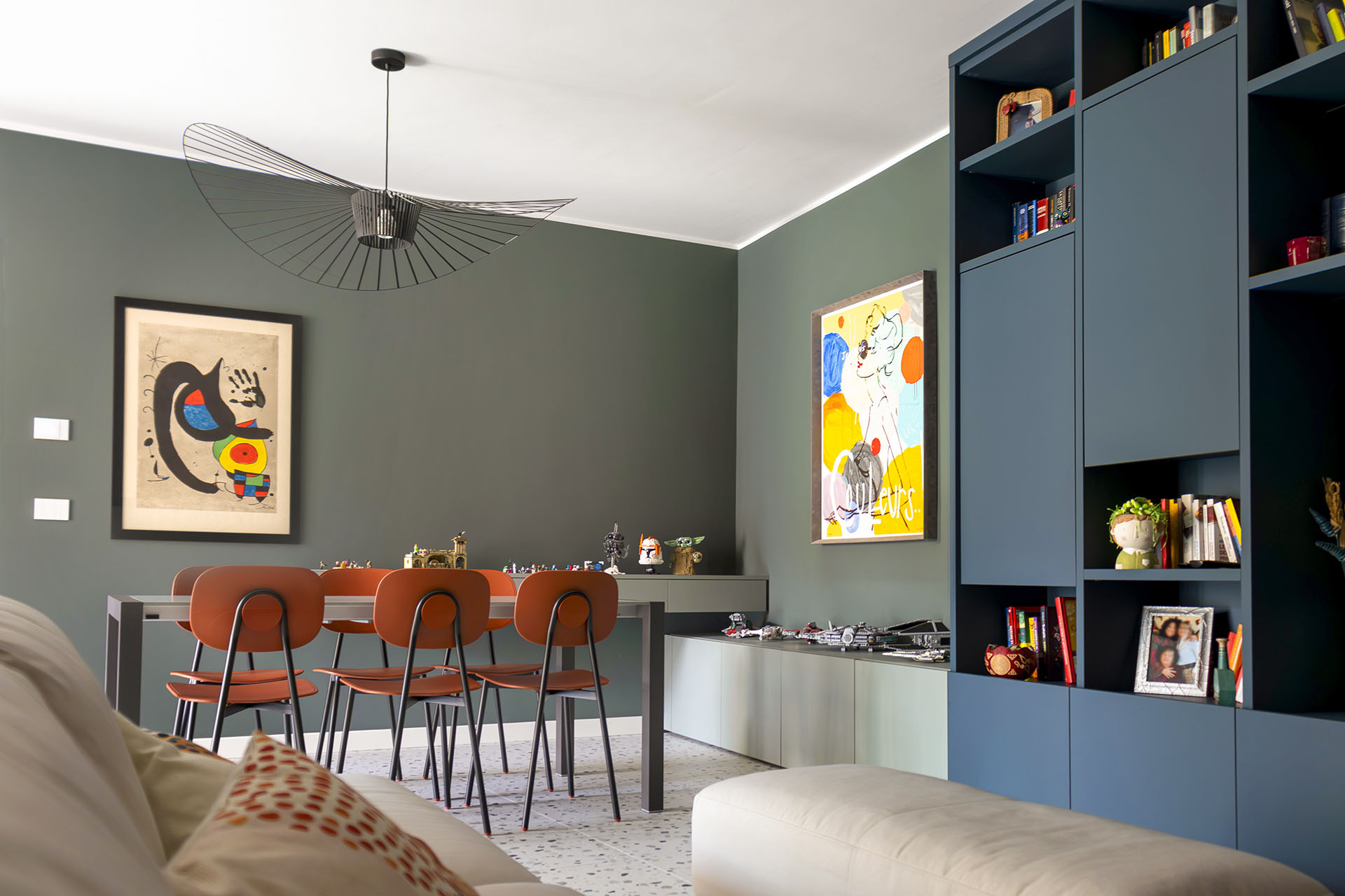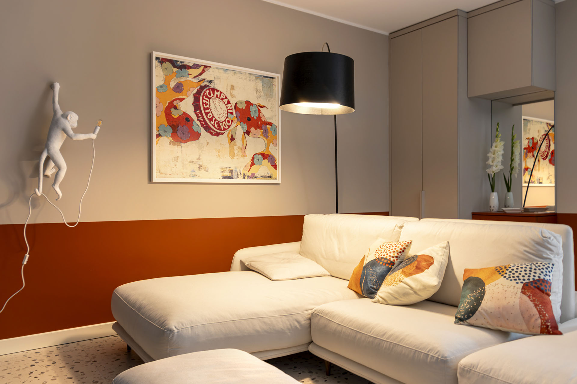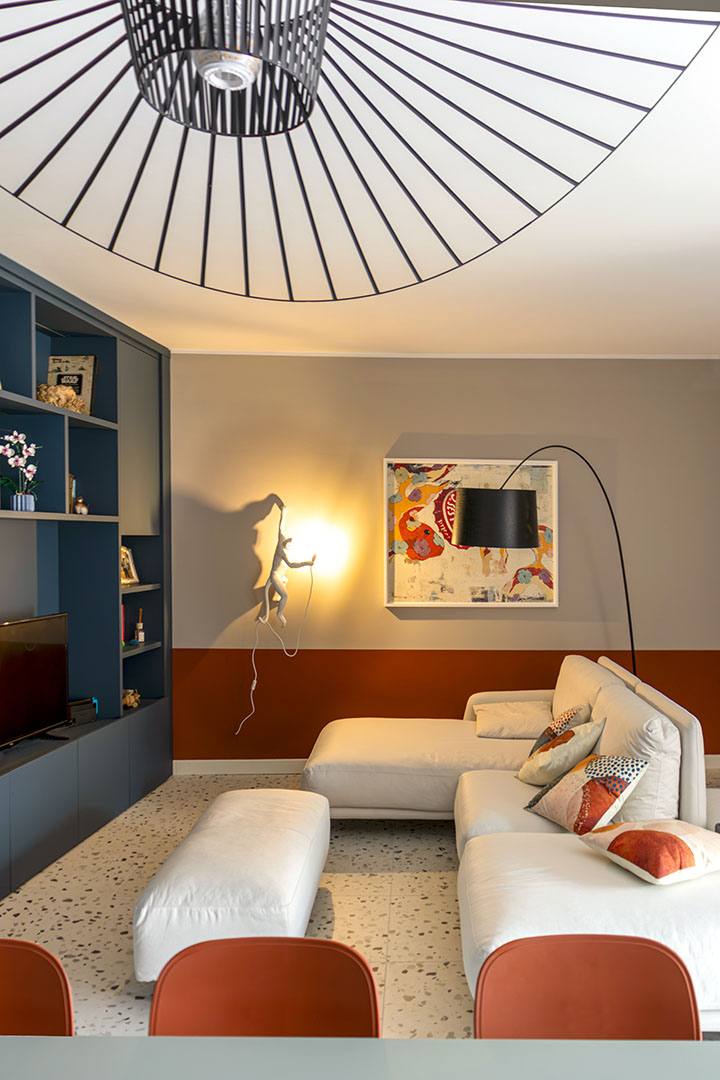 Il divano bifacciale Ditre Italia diventa elemento di snodo tra ingresso e zona pranzo, valorizzato dalla lampada Twiggy di Foscarini e dall’ironica Monkey Lamp di Seletti.