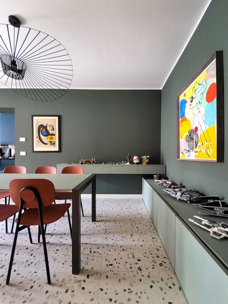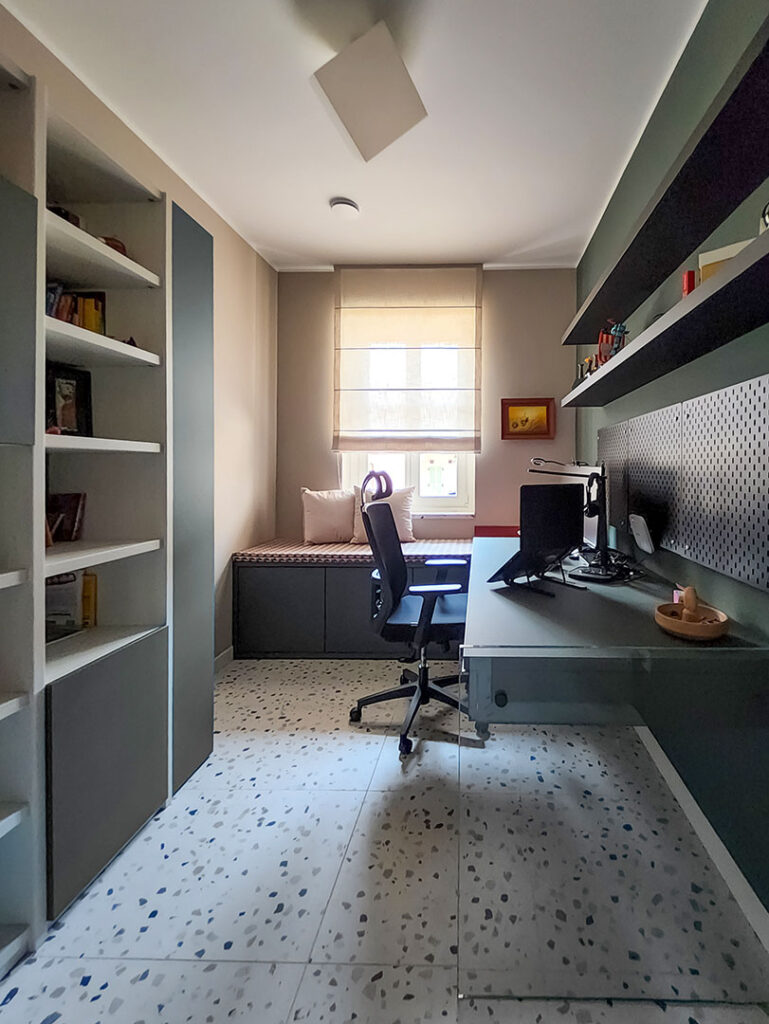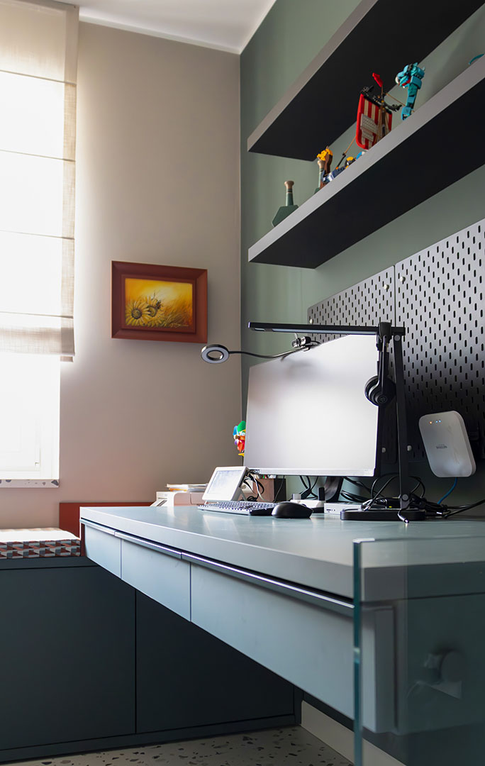 Lo studio in soli 8 mq, è progettato per essere funzionale e scenografico. La scrivania su misura, dotata di cassetti e pannello laterale in vetro, permette di mantenere ordine e leggerezza visiva, mentre la lampada da soffitto Edge 30 di Artemide garantisce illuminazione ottimale e un tocco contemporaneo.