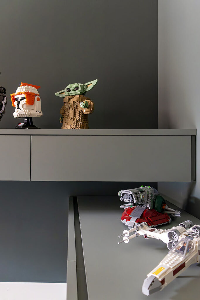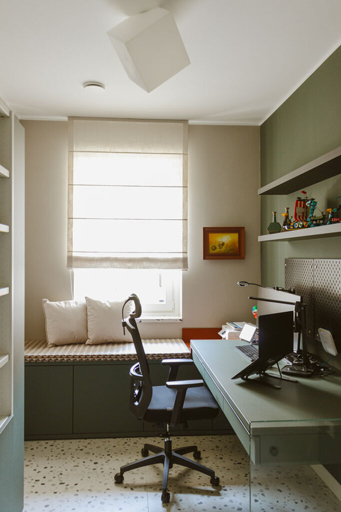 Sotto la finestra, una panca contenitiva con ante push-pull nasconde cavi e prese, offrendo anche una comoda seduta. La palette verde Comodoro FENIX®, desaturata e rilassante, crea un’atmosfera raccolta ideale per concentrarsi o concedersi una pausa.