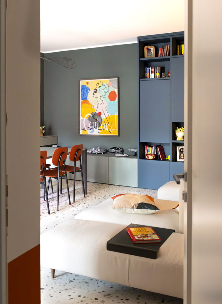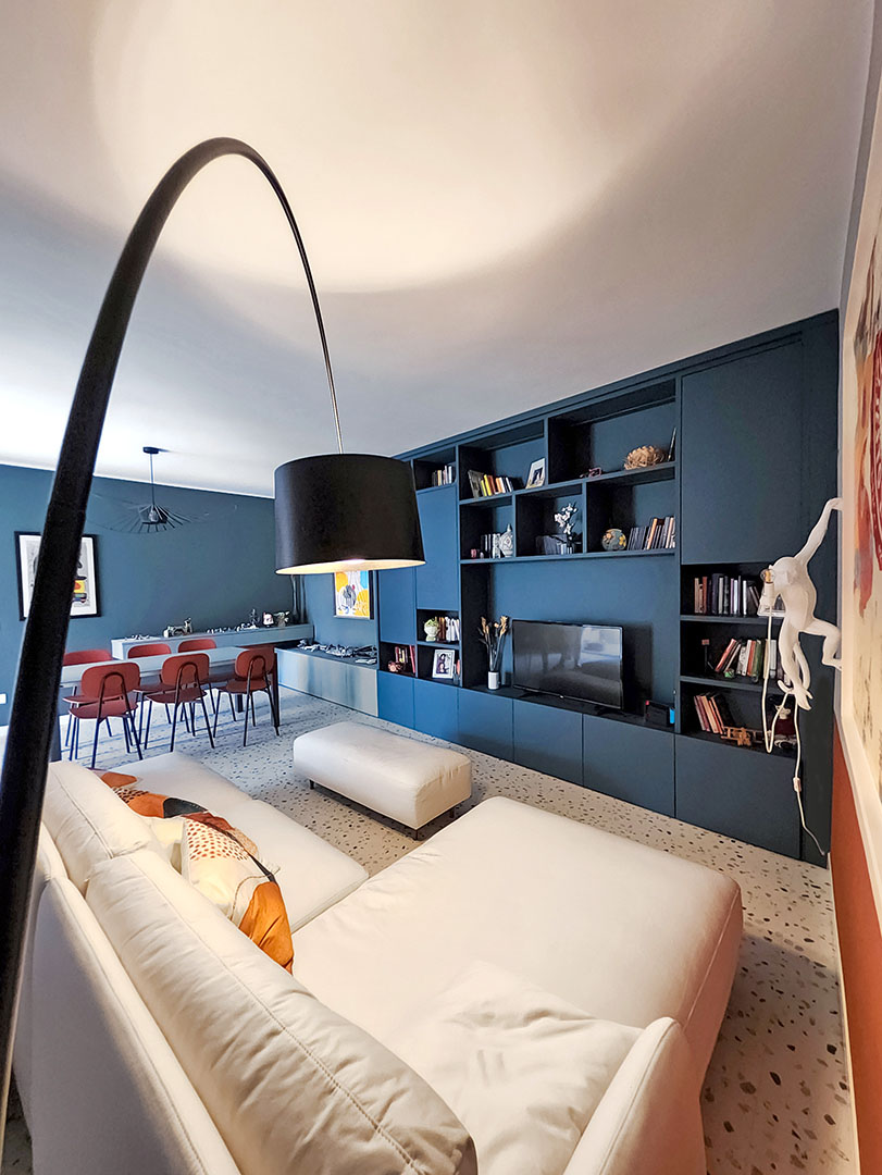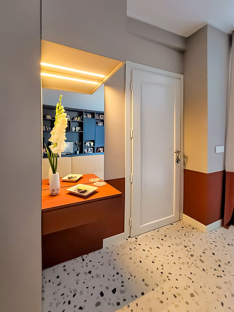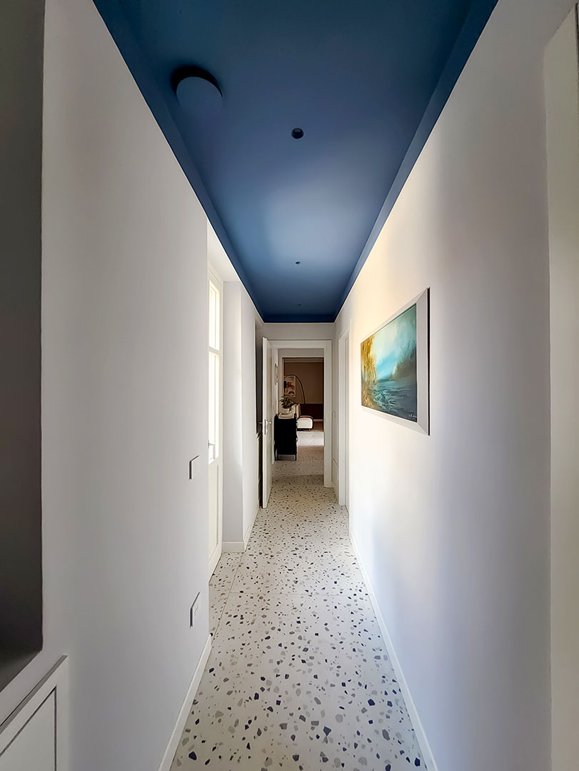 Il corridoio diventa elemento progettuale: nicchie integrate, pannellature scorrevoli e soffitto colorato in continuità con il blu della Wall System ampliano otticamente lo spazio.