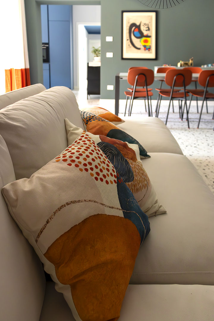 L’ingresso si affaccia direttamente sul living di 32 mq articolato in tre aree interconnesse.