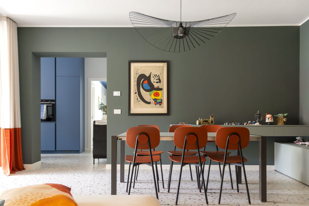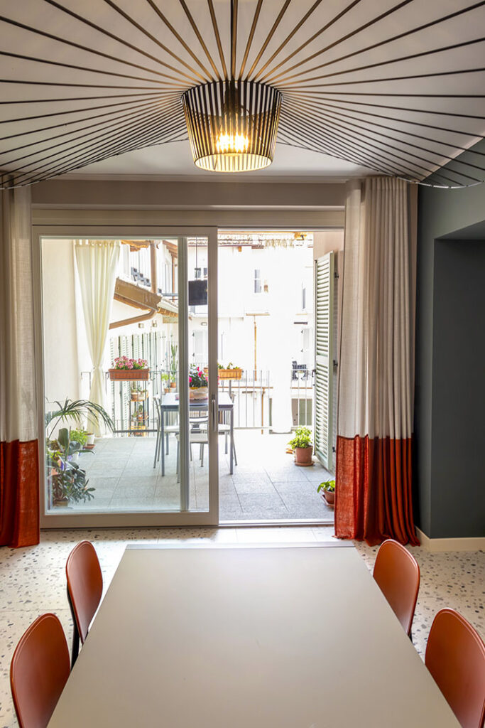 Il tavolo Kristalia Sushi, facilmente allungabile, dialoga con le sedie in tonalità rosso mattone e con la sospensione iconica Vertigo di Petite Friture, elemento leggero e altamente scenografico.