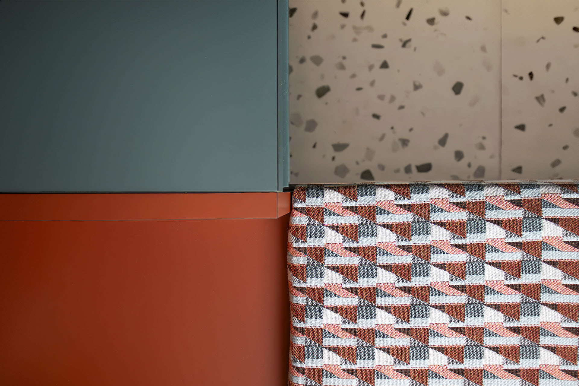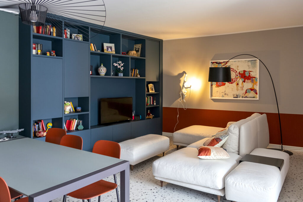 La palette Rosso Namib e Beige Dessau bilanciano i toni freddi della parete attrezzata, proseguendo anche nelle tende, mantenendo la luminosità della grande portafinestra.