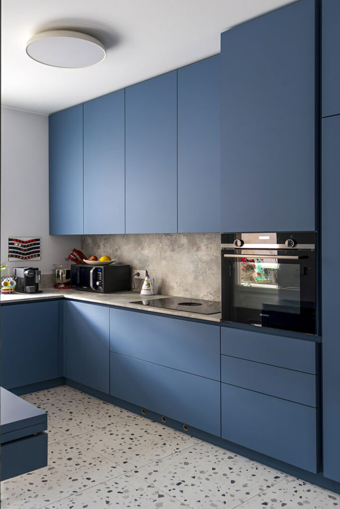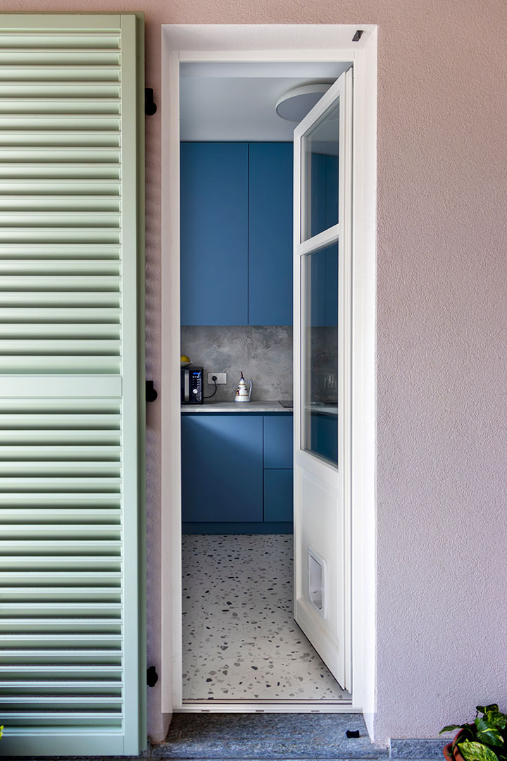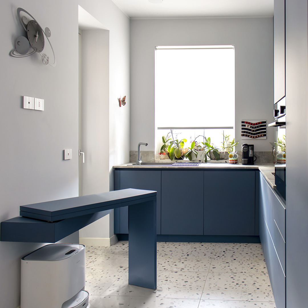 La cucina in FENIX® Azzurro Naxos è stata mantenuta nella posizione originale della casa a corte, separata dal living ma con affaccio diretto sul terrazzo coperto e sulla zona giorno, creando un dialogo visivo continuo pur preservando autonomia. Nonostante i circa 19 mq, lo spazio è ottimizzato per cucinare, fare colazioni e momenti conviviali, grazie a soluzioni contenitive intelligenti.