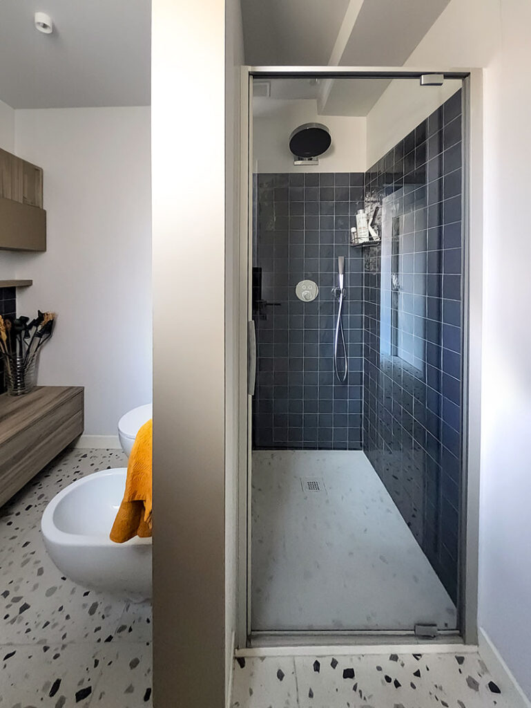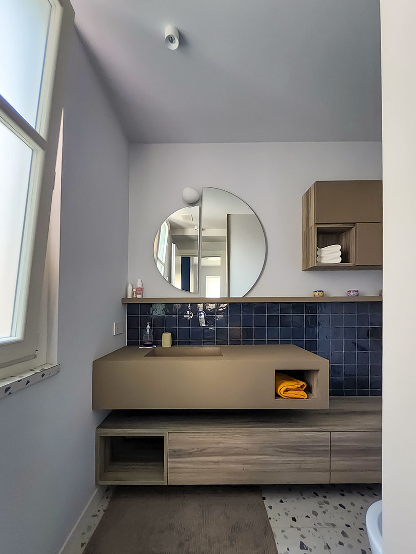 Gres porcellanato effetto terrazzo e rivestimenti Zellige, conferiscono matericità e vibrazione luminosa agli ambienti di servizio.