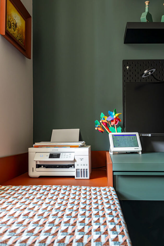 La stampante è posizionata in un piccolo angolo colorato ripreso nei cuscini della panca e gli accessori coordinati completano l’organizzazione.