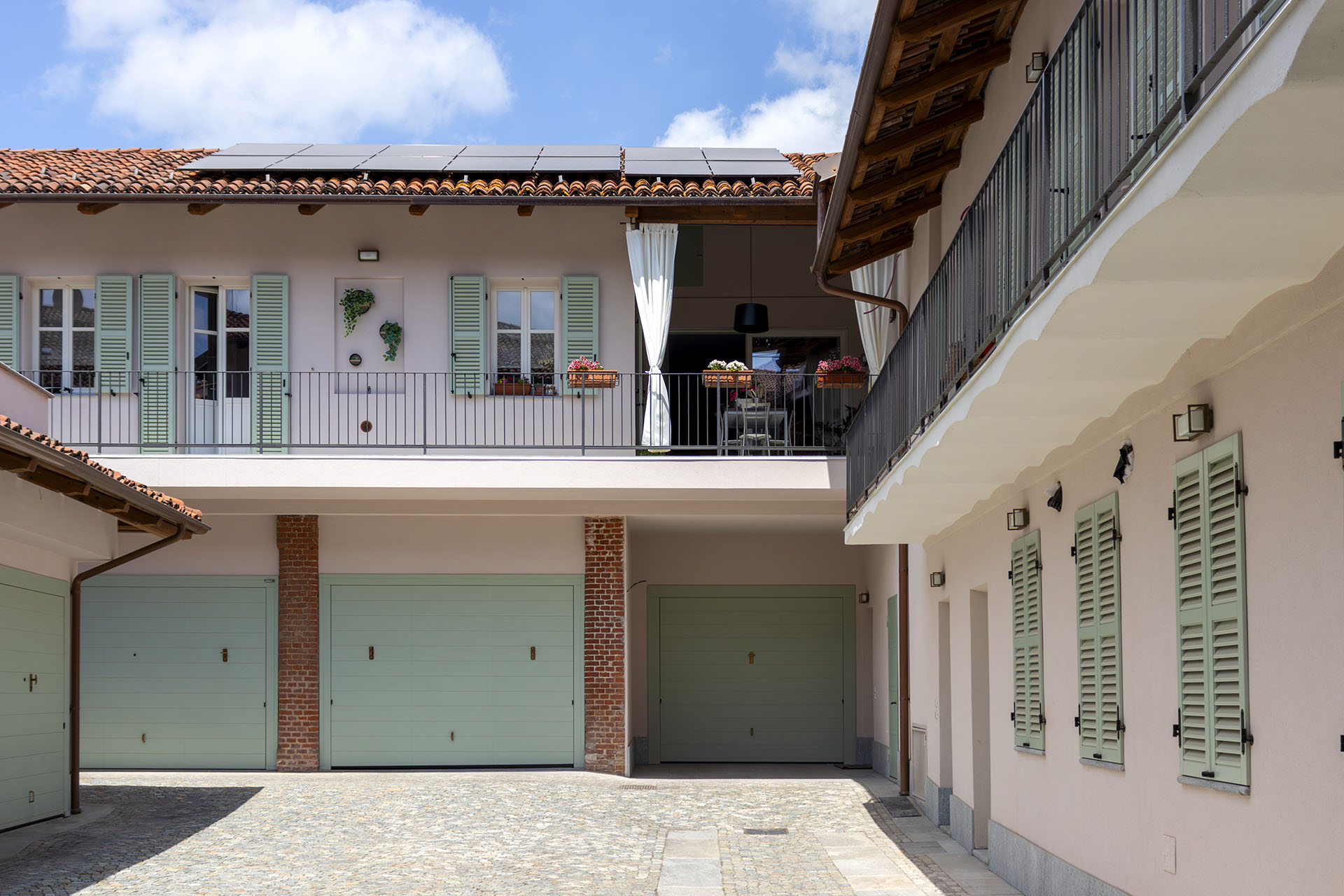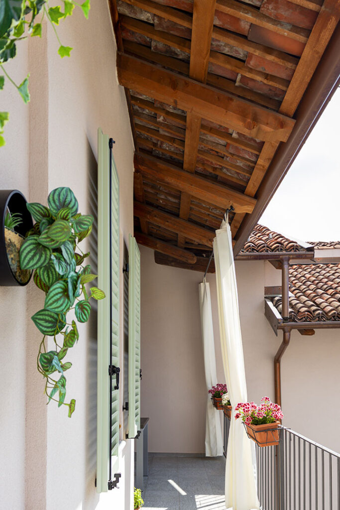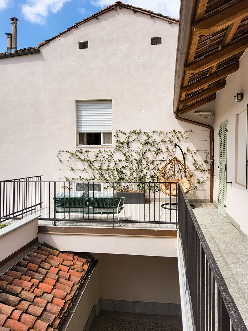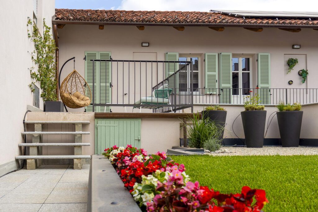 Il tetto giardino sopra il box auto diventa un ulteriore livello da vivere, un angolo verde urbano che offre privacy e una nuova prospettiva sulla corte piemontese. Uno spazio versatile che può trasformarsi in solarium, area lounge, area barbecue o piccolo giardino pensile, valorizzando al massimo l’esposizione a sud e la luce naturale.