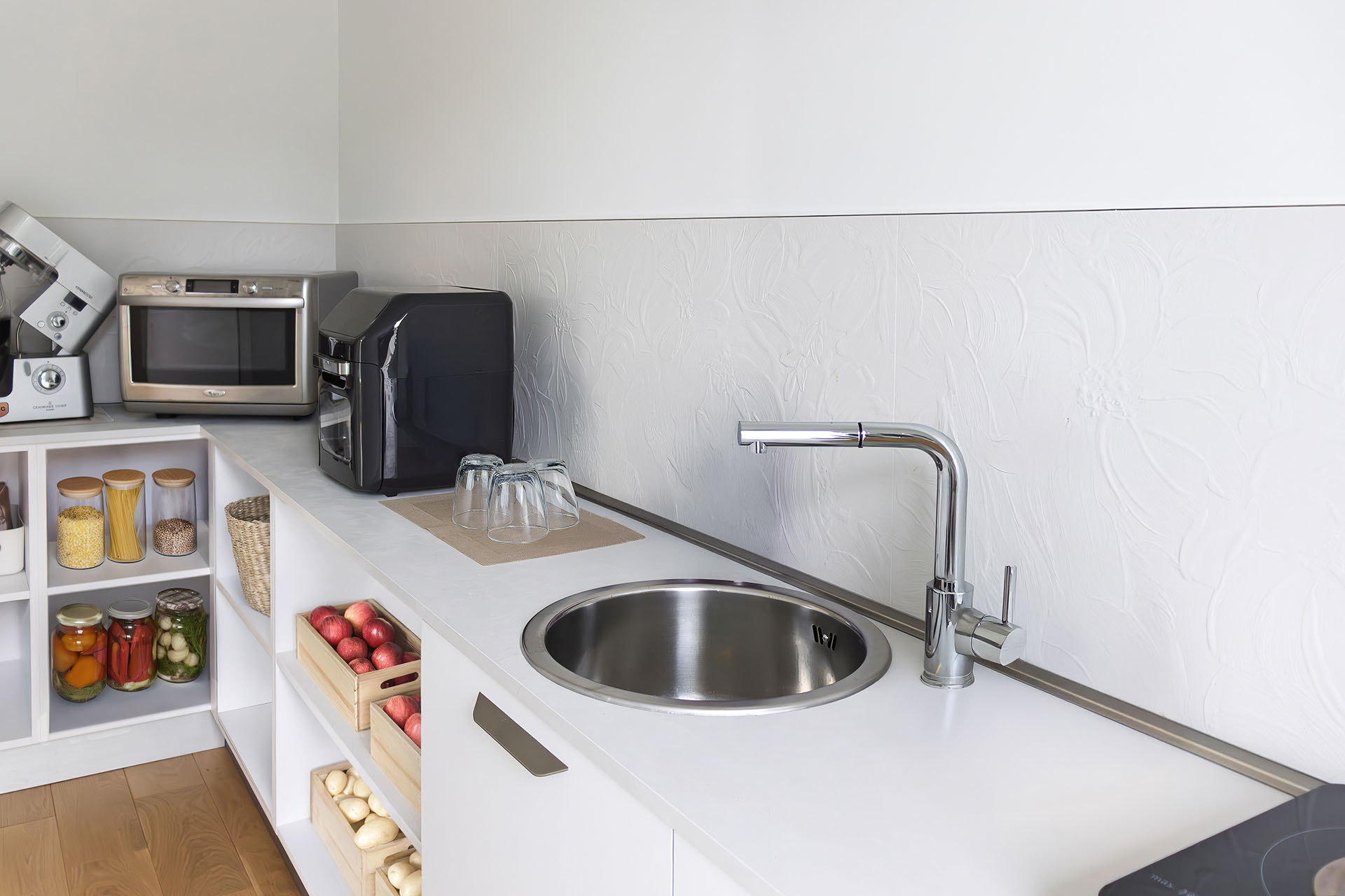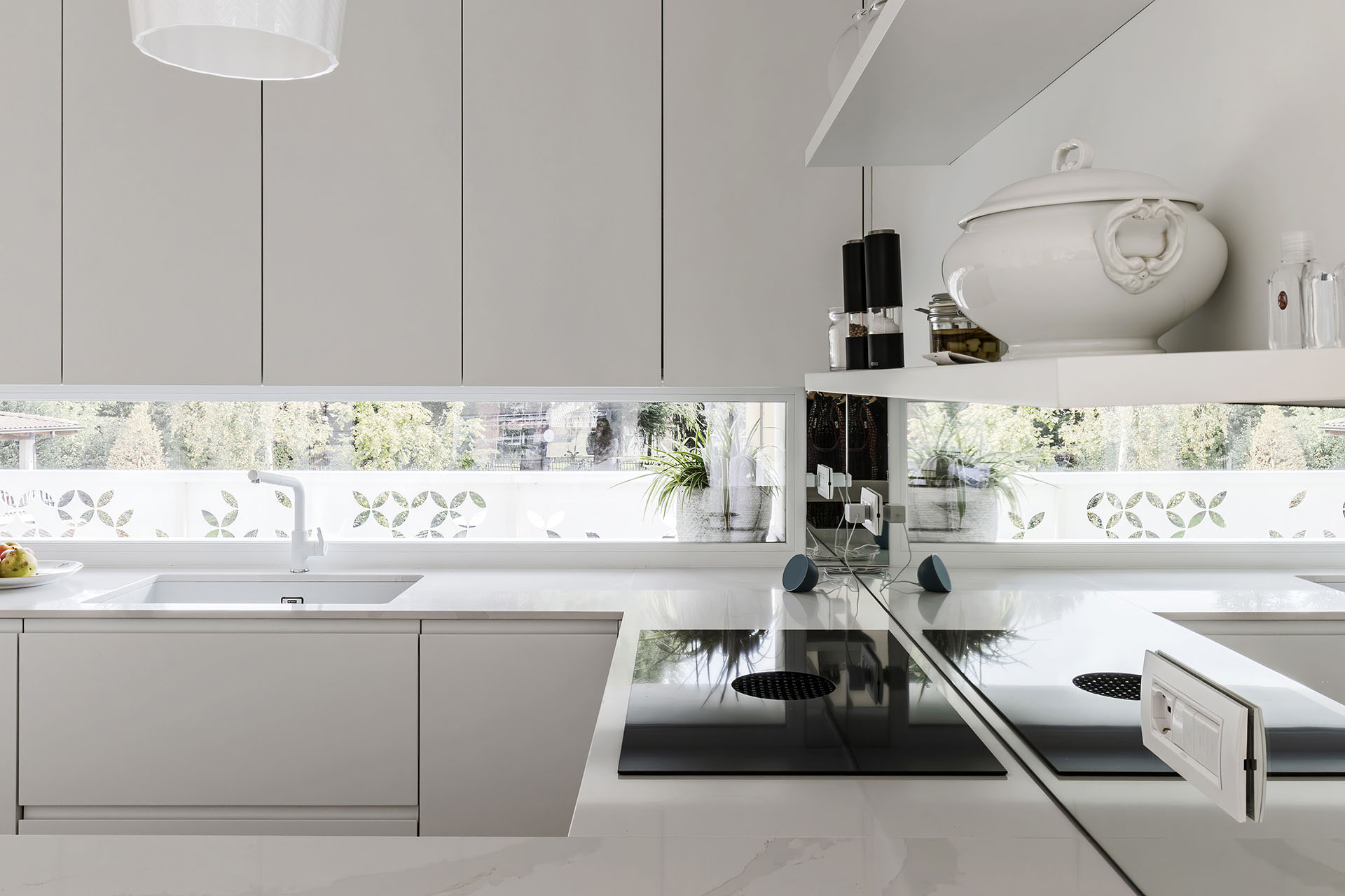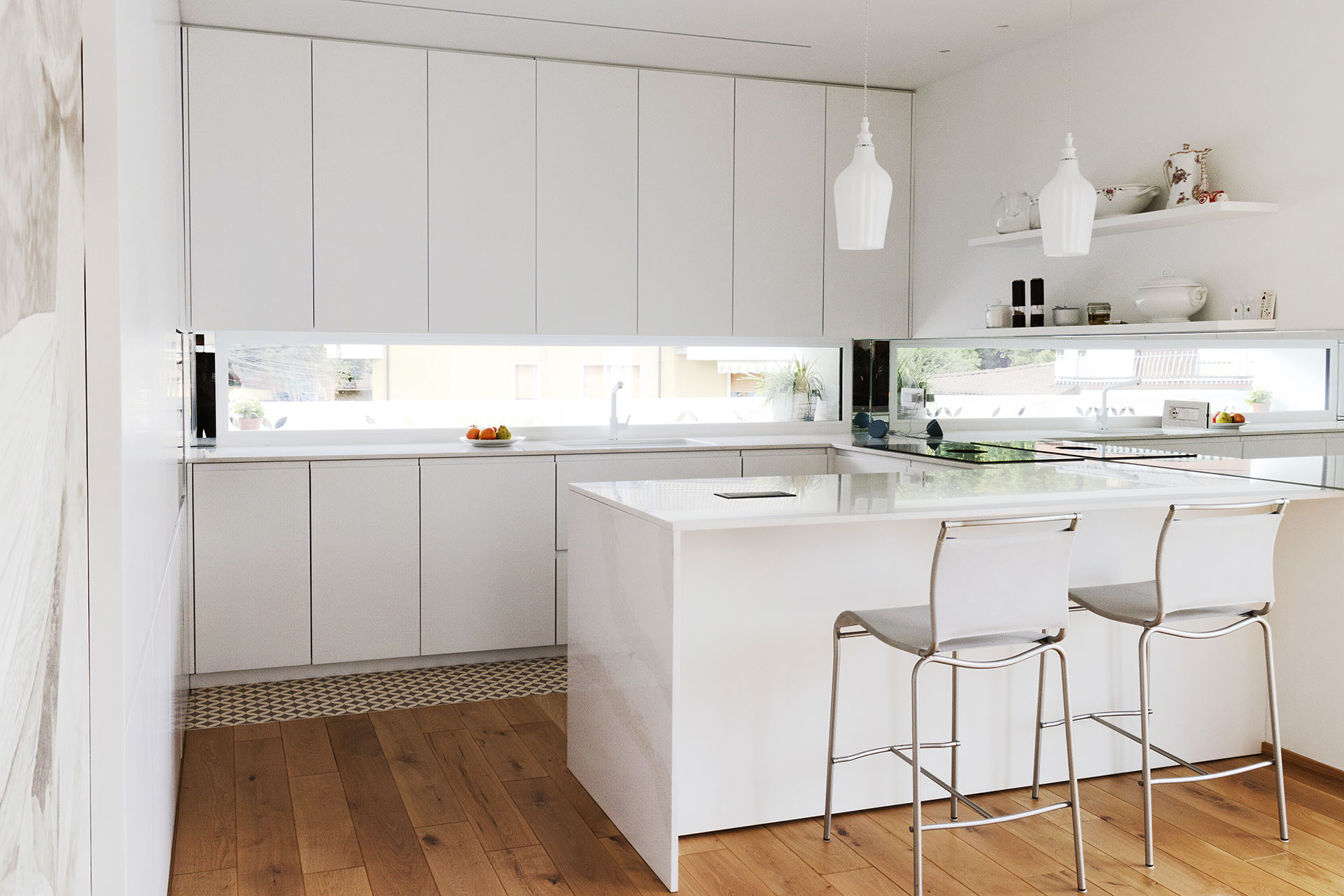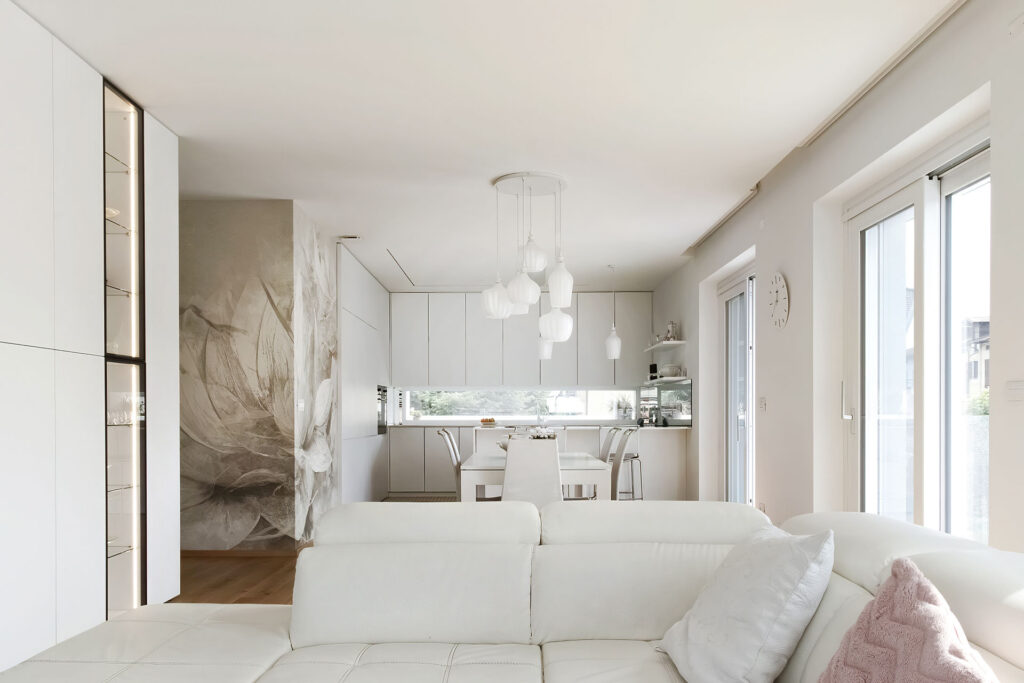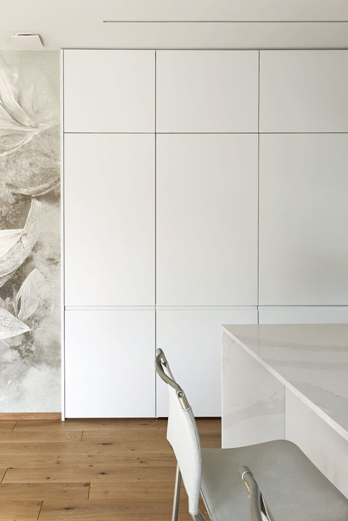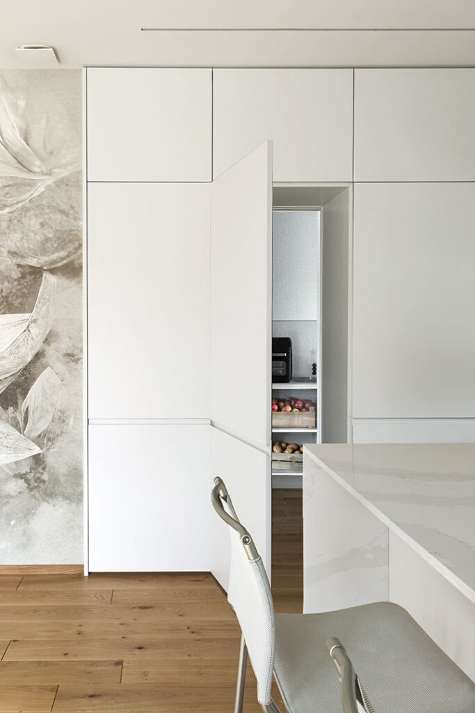 Elemento chiave del progetto è la capiente dispensa integrata e invisibile: la porta si mimetizza tra le colonne della cucina, garantendo continuità visiva, ordine formale e massima funzionalità.