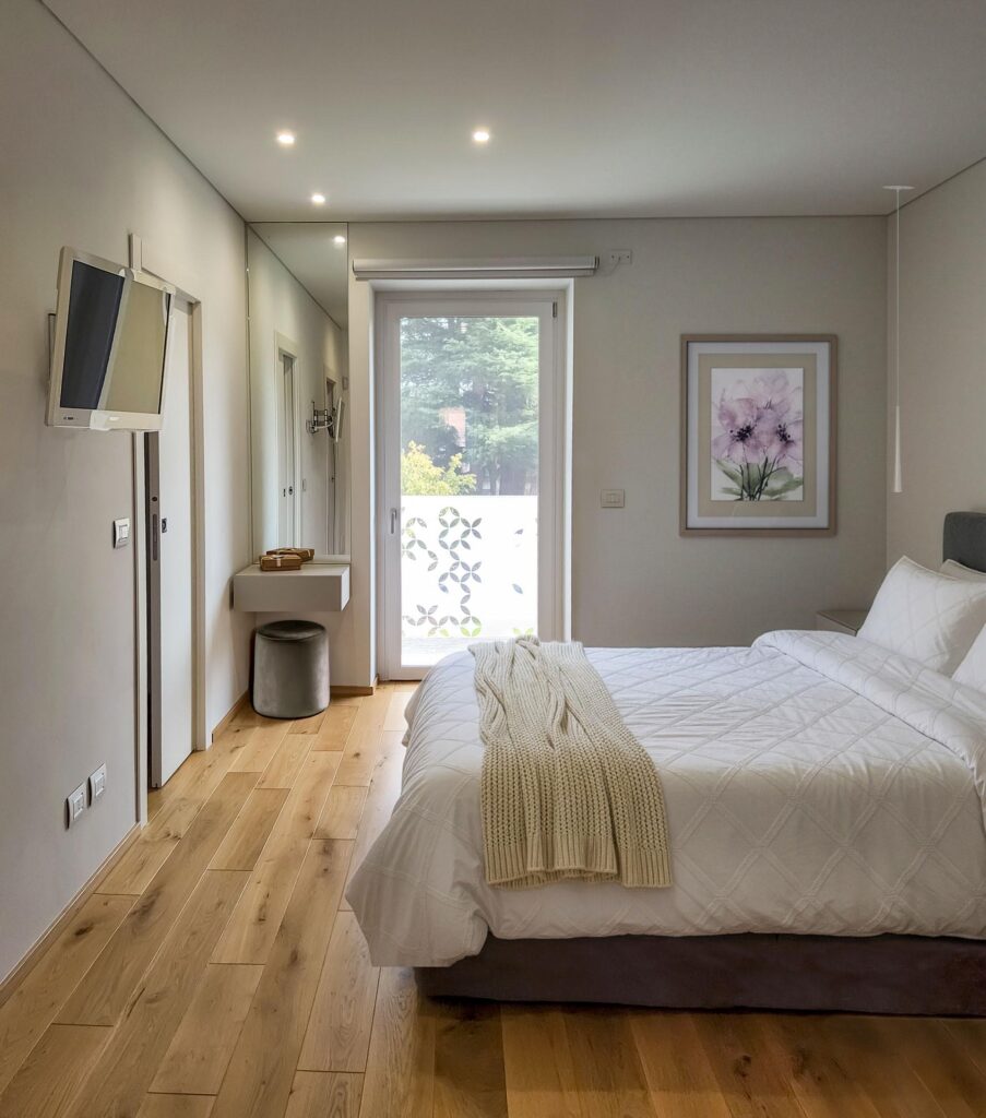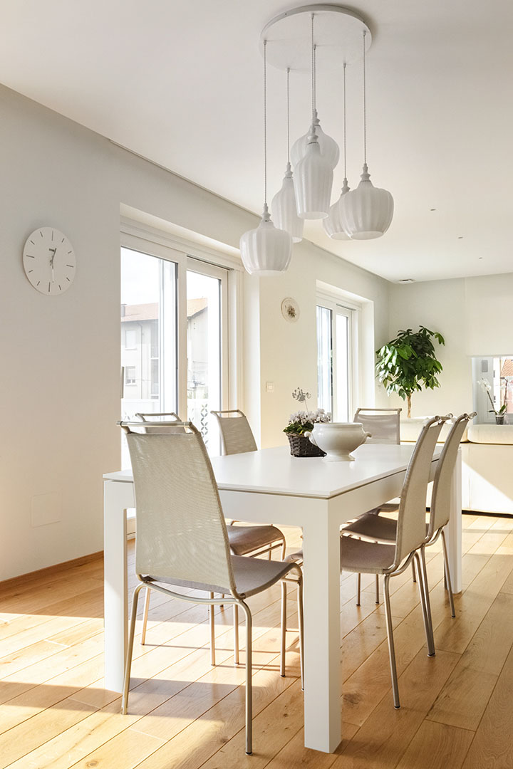 Spazio fluido e luminoso, parquet caldo e tonalità naturali.