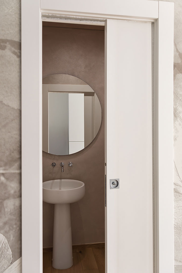 La porta scorrevole a tutta altezza in specchio invece, separa zona giorno e zona notte amplificando profondità e luminosità.
