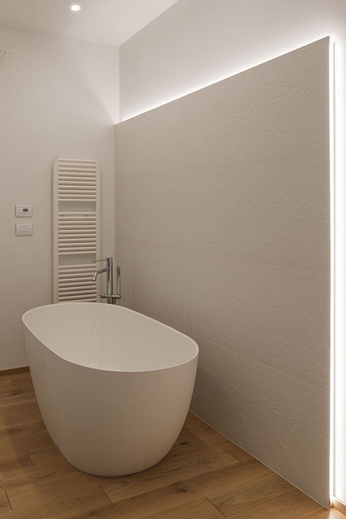 Bagno privato con vasca freestanding valorizzata da rivestimento 3D e illuminazione LED.