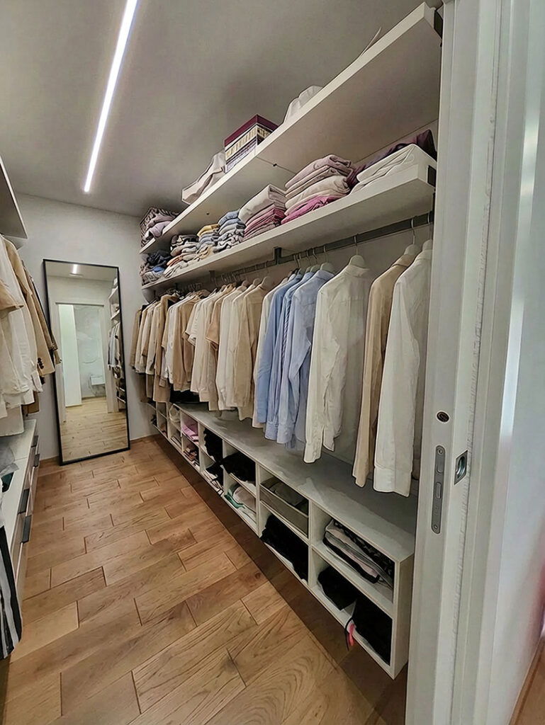 Guardaroba separato lui e lei progettato al centimetro per massimizzare contenimento ed ergonomia.