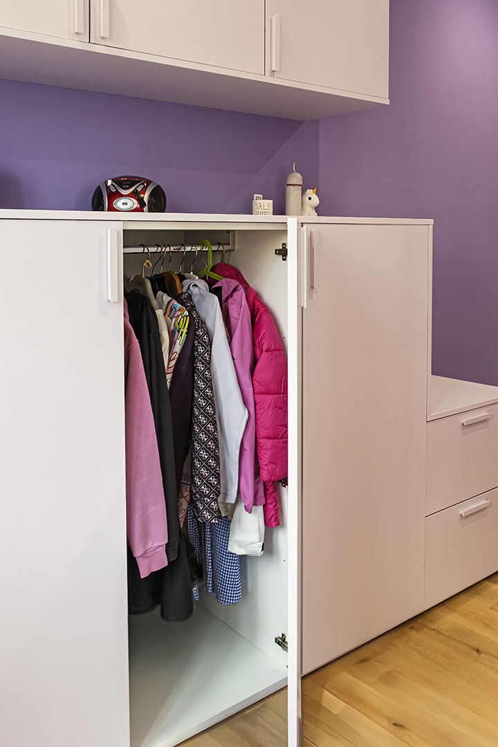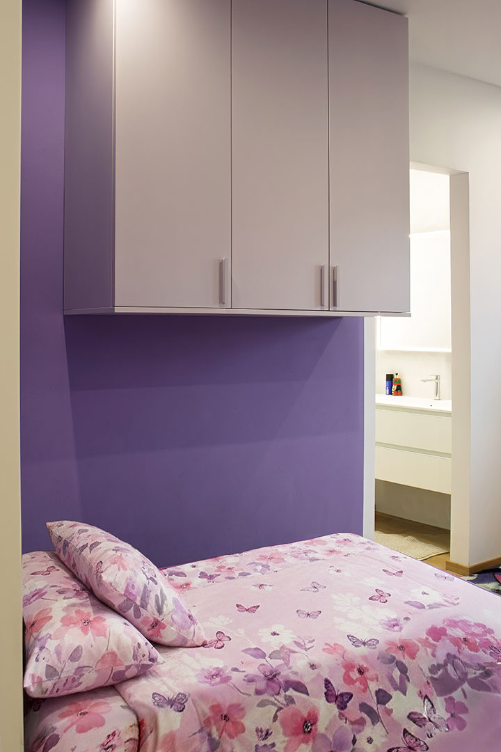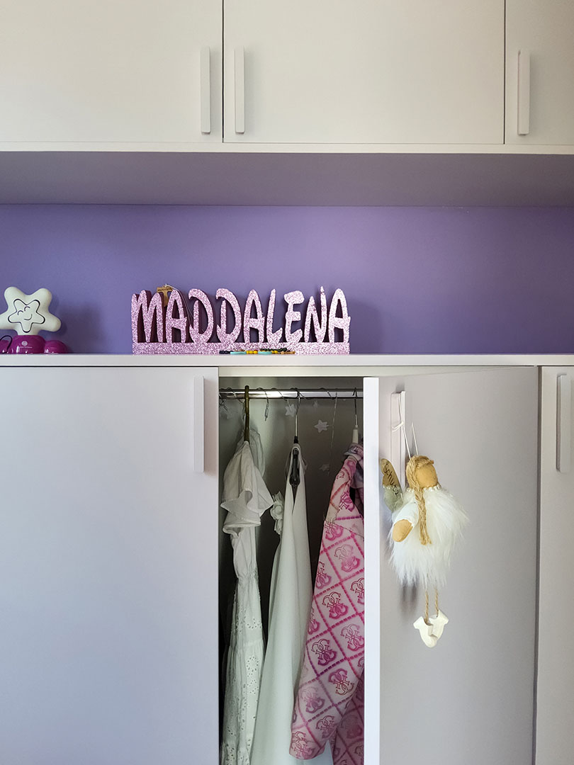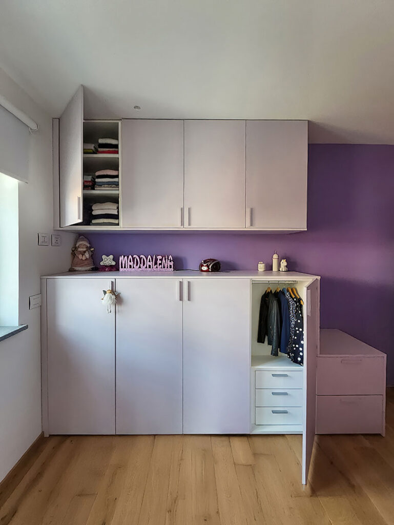La stanza della bambina, con pareti lilla, integra armadio studiato per non ostacolare la luce naturale, appenderia ribassata per favorire autonomia e arredi multifunzione.
