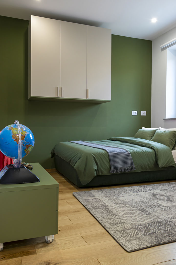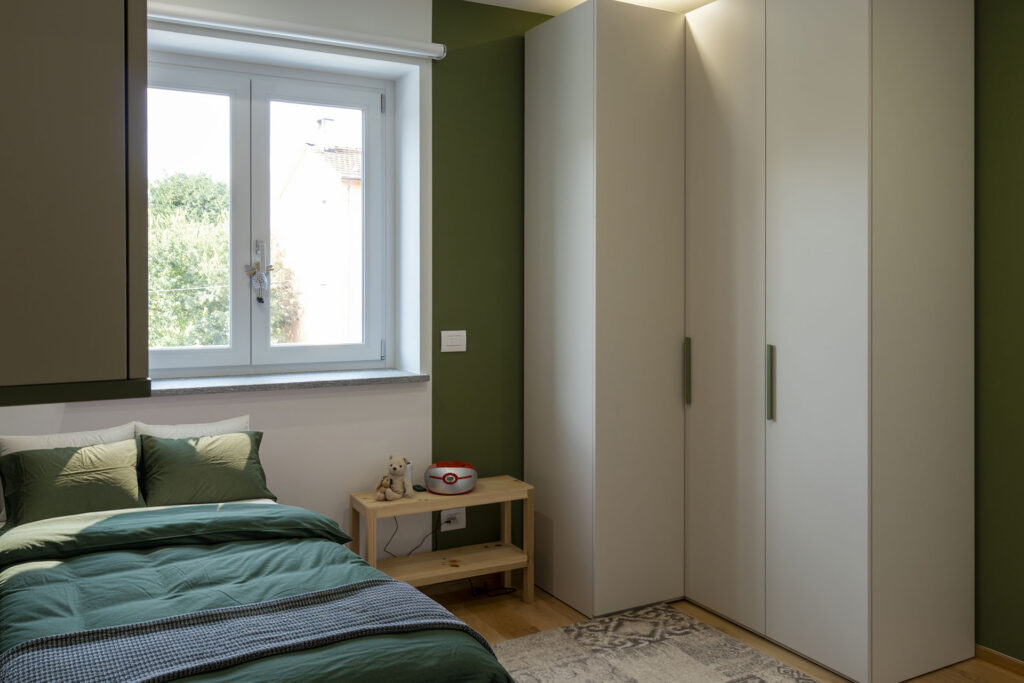 La camera del fratellino, caratterizzata da tonalità verdi, prevede letto già dimensionato per la crescita e armadio organizzato internamente per facilitare indipendenza.