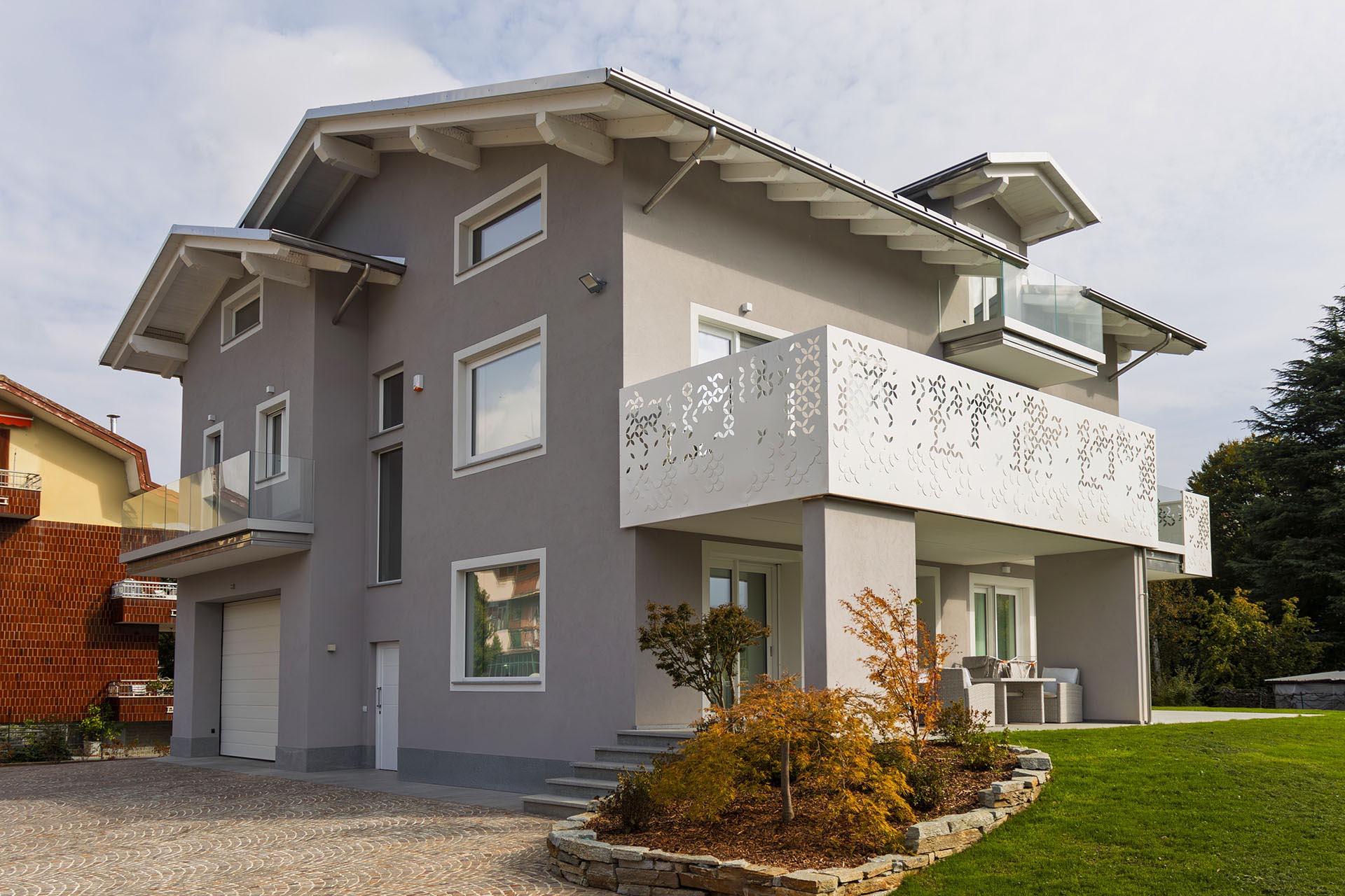 Gres grigio e arredi bianchi garantiscono continuità stilistica e praticità.