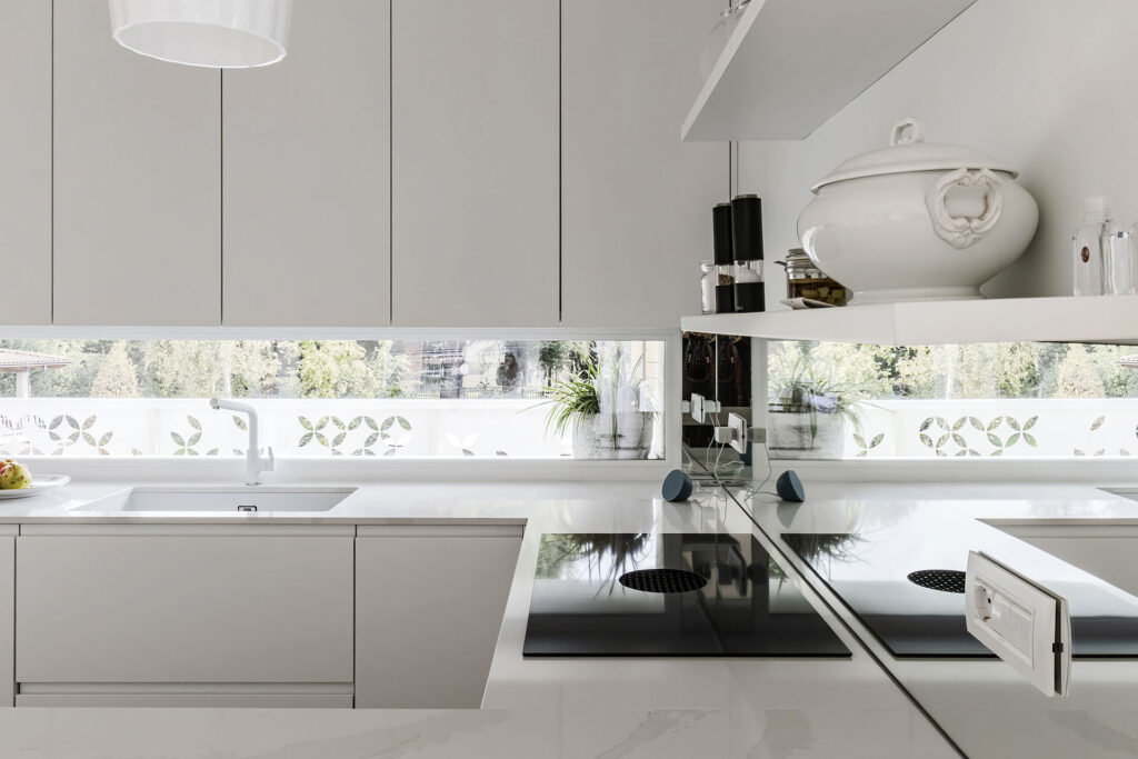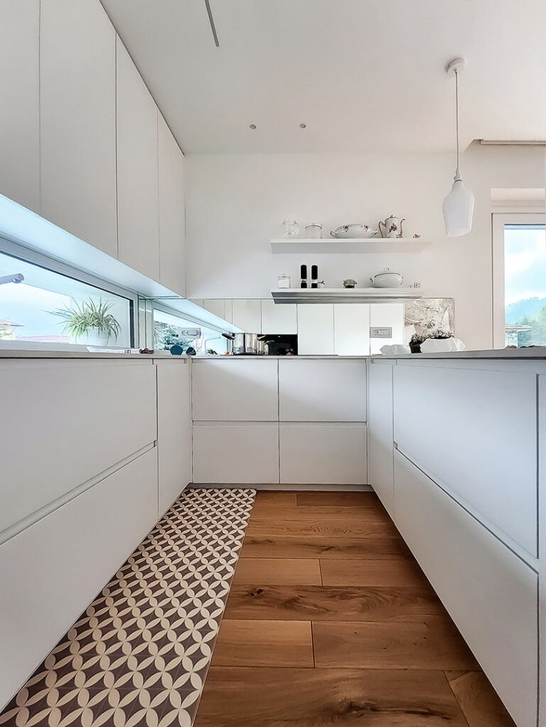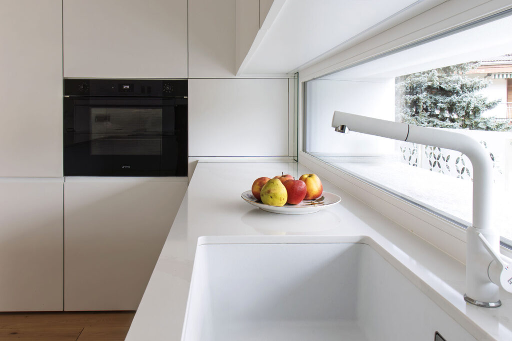 La cucina su misura si integra nell’architettura con volumi lineari e superfici continue.